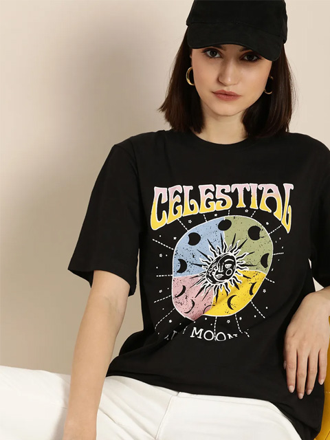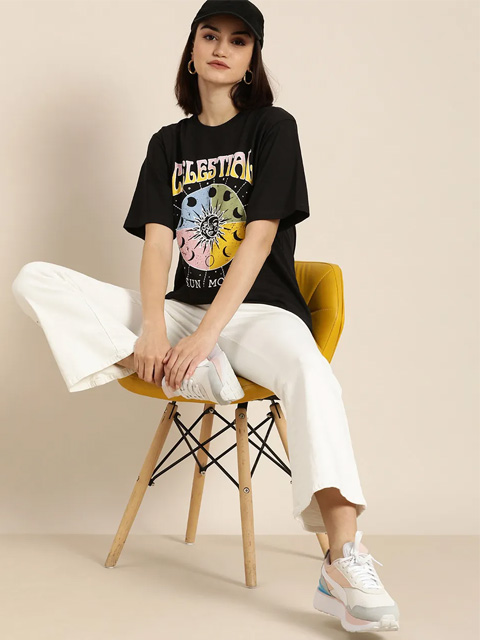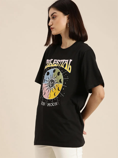 Black Graphic Printed Oversized Cotton Longline T-shirt for Women