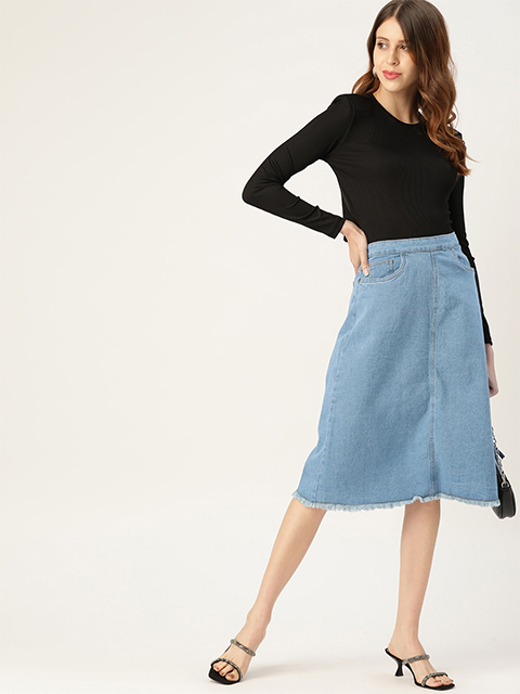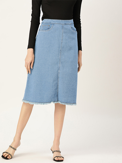 The Skirt Is Made Of Blue Woven Denim, Has Three Pockets, Three Button Closures, And A Flared Hem