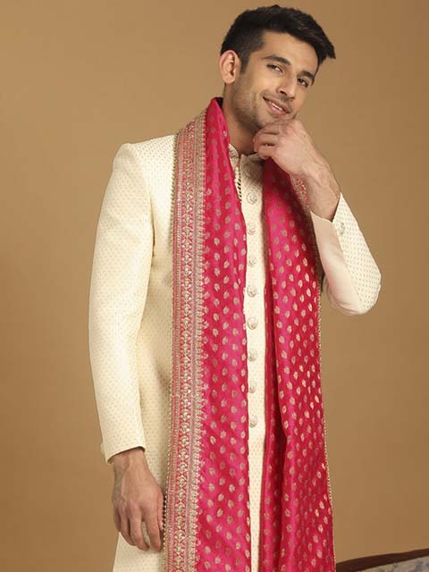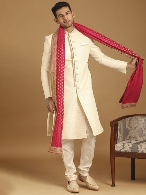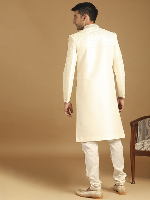 Wear this sherwani set to show off your style! Cream is the color of this exquisite sherwani set. Style this piece with your favorite accessories and head out to any event.