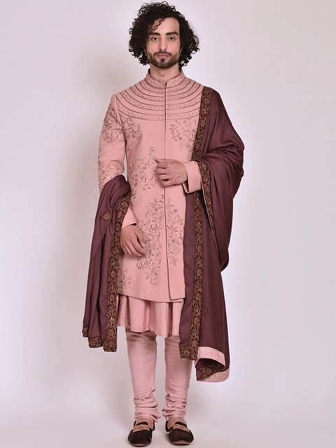 An embroidered floral motif decorates the pink sherwani. It is paired with a churidar, kurta, and embroidered contrast dupatta.