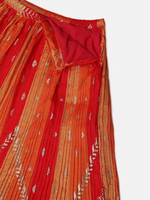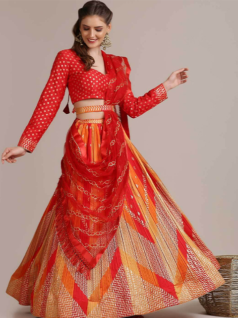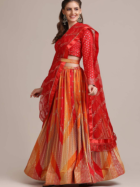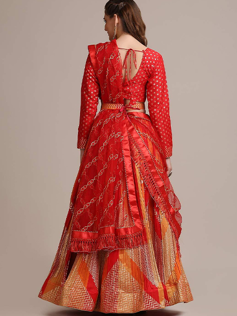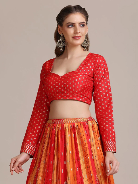 Red embroidered unstitched blouse, has a V neck, Full sleeves, red embroidered semi-stitched lehenga, has drawstring closure, flared hem