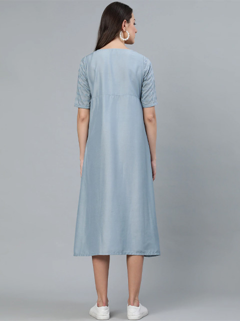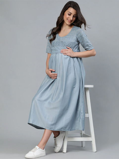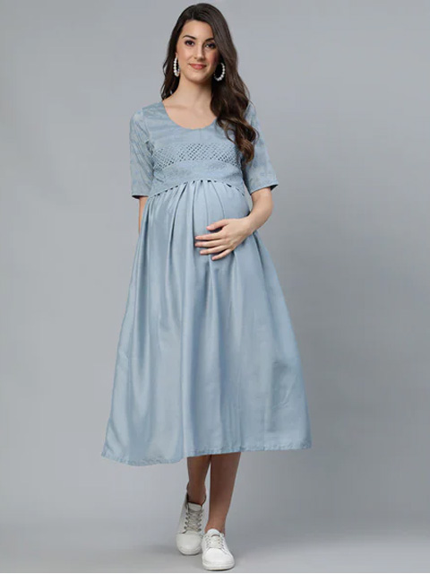 Sky blue Embroidered Maternity Fit and Flare Dress for Women
