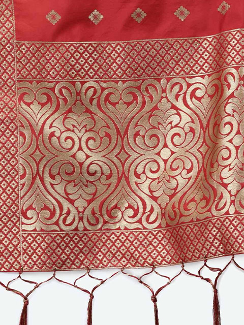 Red Printed unstitched blouse, has Full sleeves, red embroidered semi-stitched lehenga, has drawstring closure, flared hem