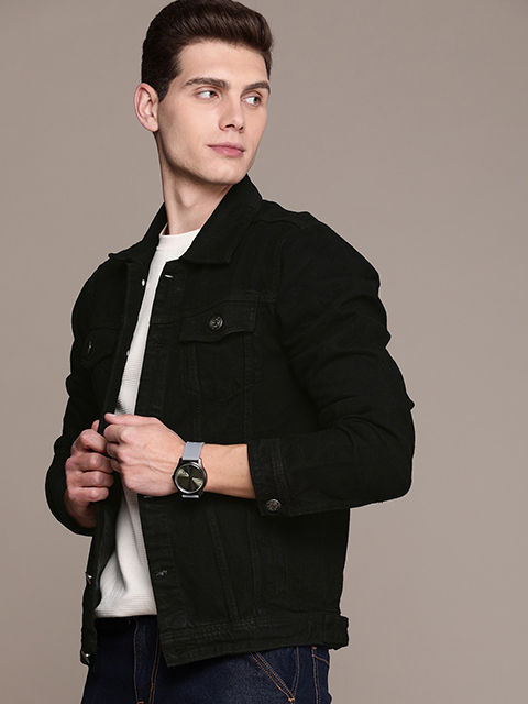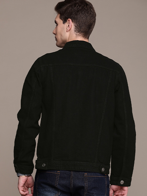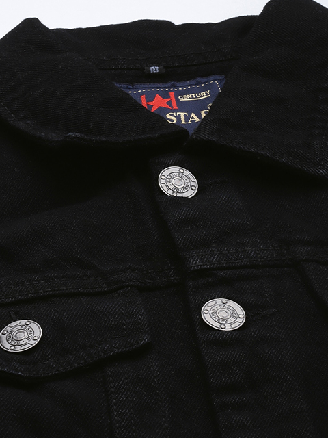 Black solid jacket, has a spread collar, 4 pockets, button closure, long sleeves, straight hem, and unlined lining