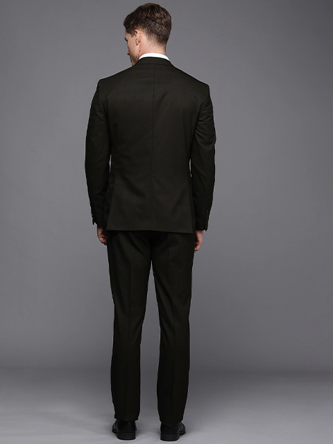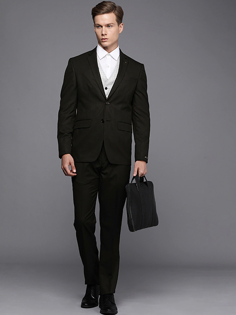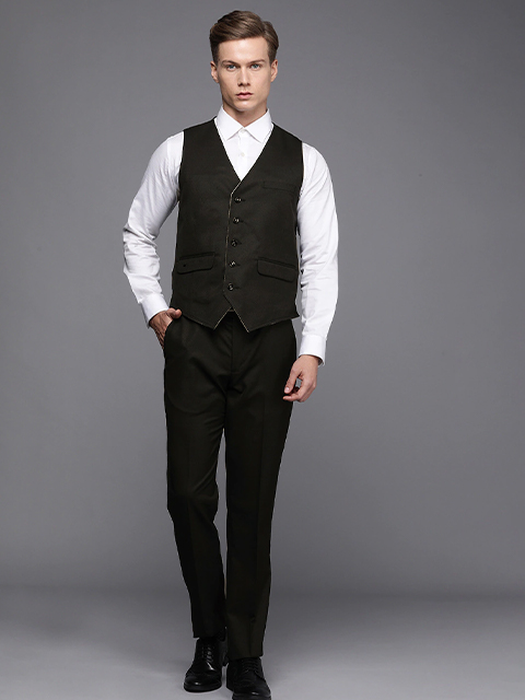 This formal 3-piece suit consists of a blazer, a pair of trousers, and a waistcoat