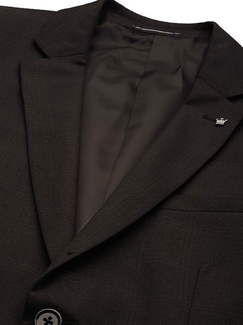 Black solid formal blazer, has a notched lapel collar, single-breasted with double-button closures, long sleeves, two flap pockets, one chest welt pocket