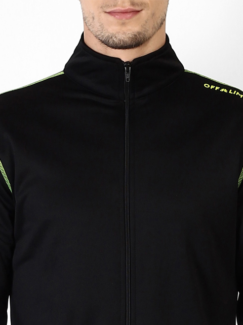 Black solid track jacket, has a mock collar, long sleeves, a full zipper placket, two pockets.