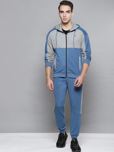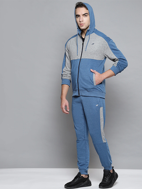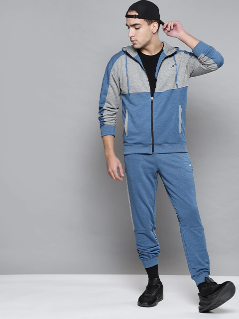 This blue and grey melange tracksuit consists of a hooded sweatshirt and a pair of joggers.
