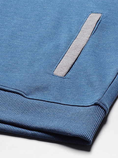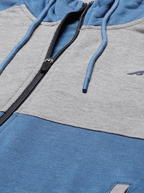 Blue and grey melange colourblocked sports sweatshirt, has a hooded neck with draw-cords, long sleeves, zip closure, ribbed hem, and 2 pockets.