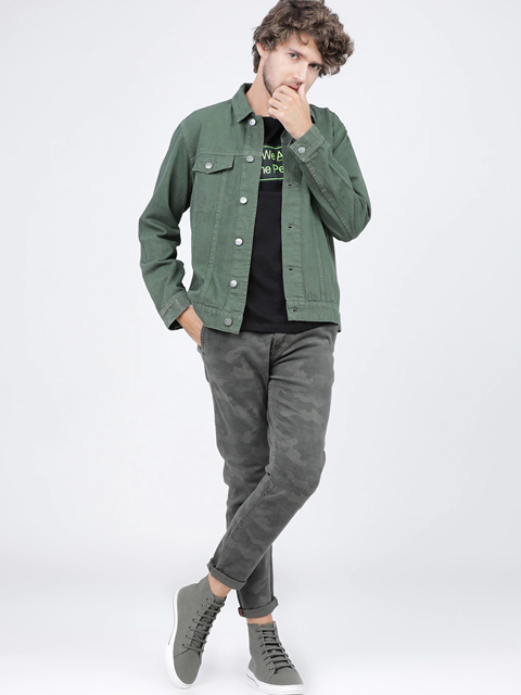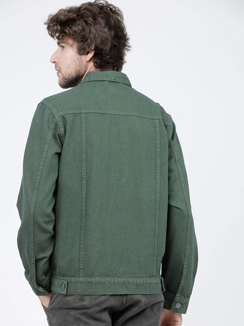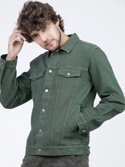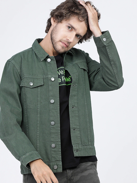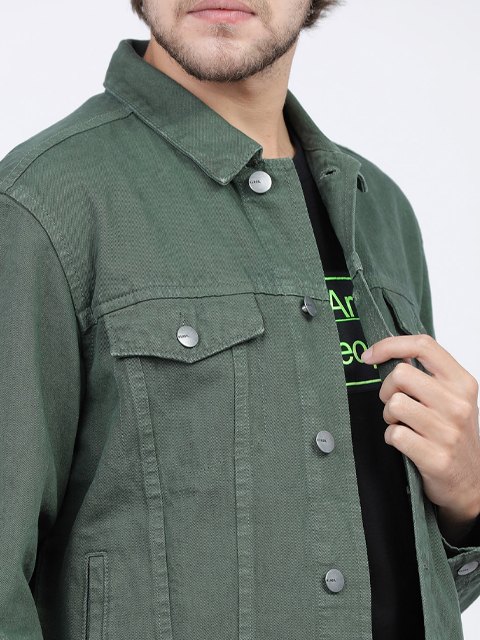 Green solid jacket, has a spread collar, 4 pockets, button closure, long sleeves, straight hem, and unlined lining