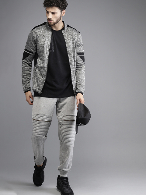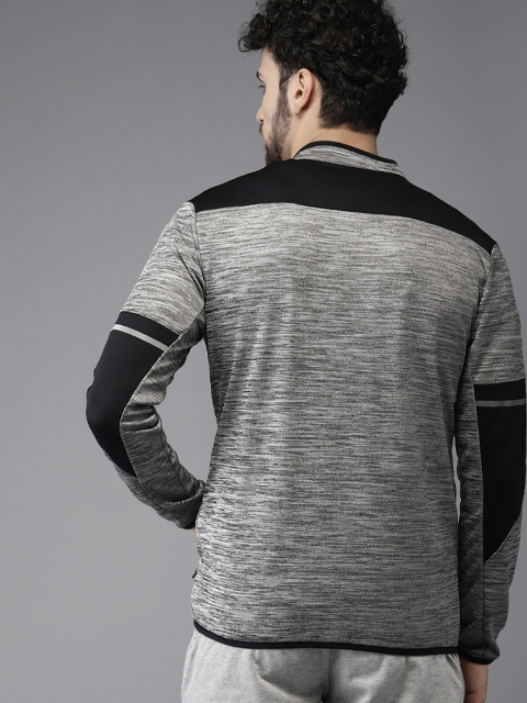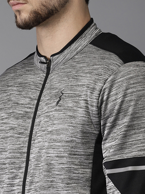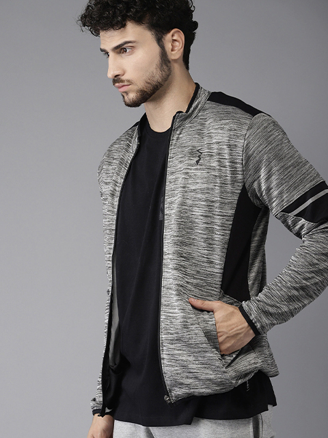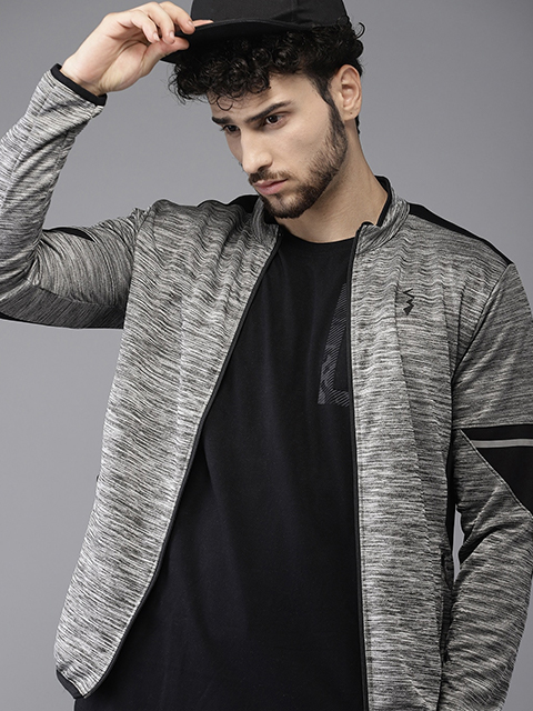 Grey self-design jacket, has a stand collar, 2 pockets, zip closure, long sleeves, straight hem, is unlined