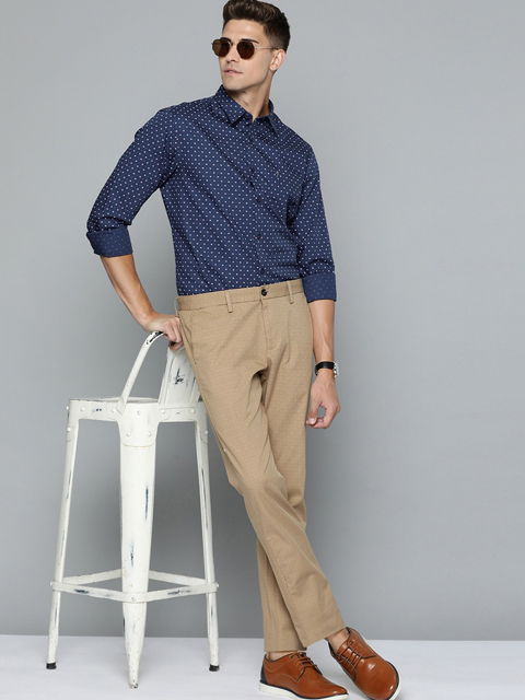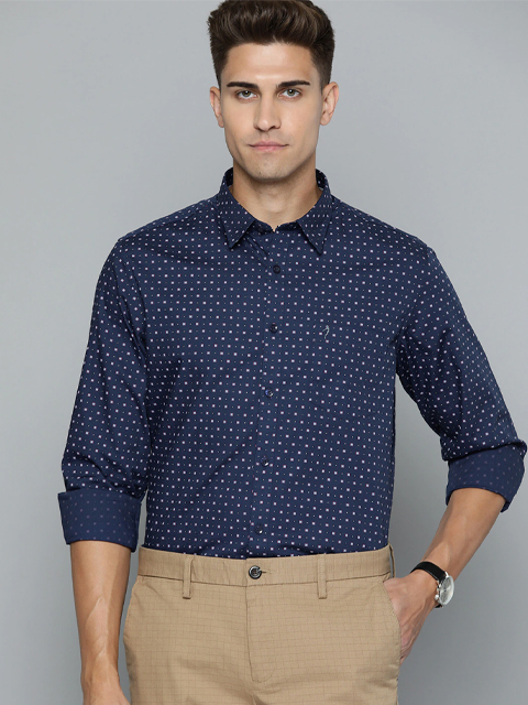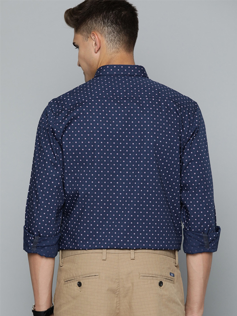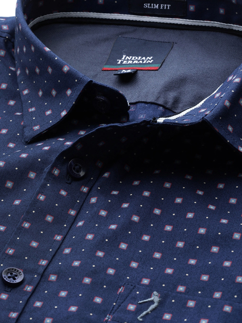 Navy blue and geometric printed opaque Casual shirt, has a spread collar, button placket, 1 patch pocket, regular long sleeves, curved hem