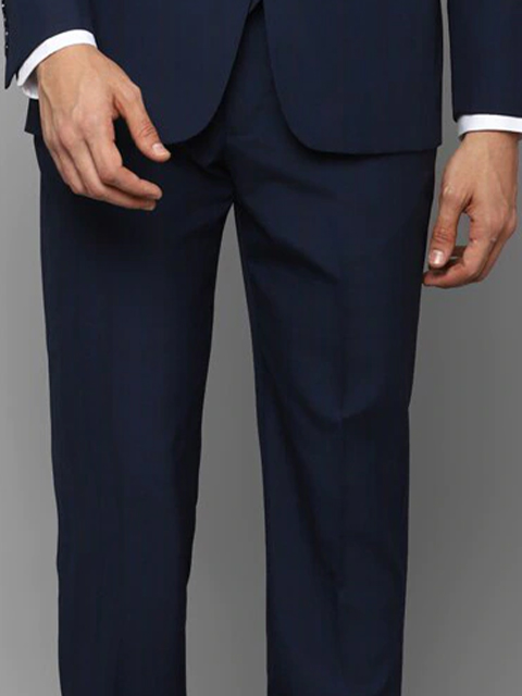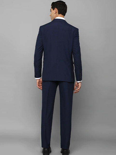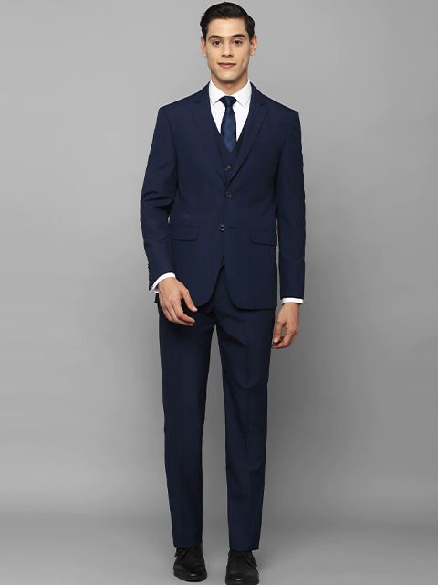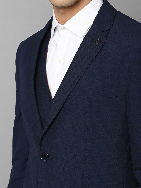 Navy Blue solid blazer, has long sleeves, single-breasted, notched lapel collar, 2 pockets, and button closure