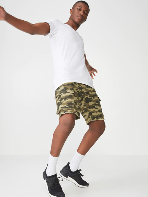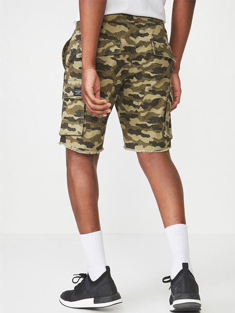 Olive Green and beige printed mid-rise cargo shorts, has 6 pockets, and drawstring closure