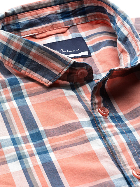 Peach-colored tartan checks opaque Casual shirt, has a spread collar, button placket, regular long sleeves, curved hem