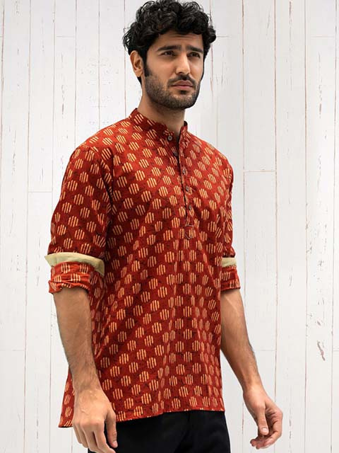 Red and falu red ethnic motifs woven design with round neck Long and flared sleeves. A-line shape with angrakha style along with Thread work detail above knee with curved hem. Machine weave regular cotton.