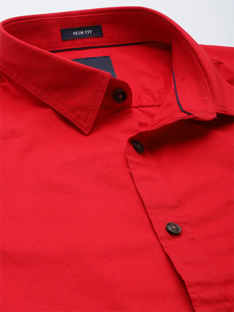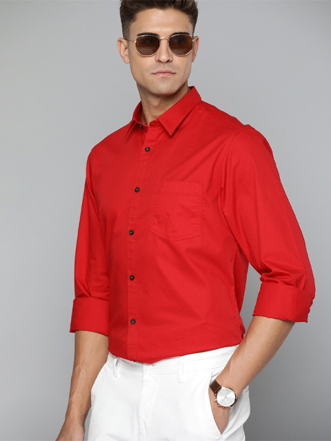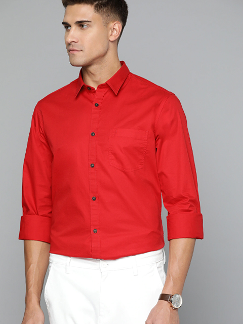 Red solid Casual shirt, has a spread collar, button placket, 1 patch pocket, regular long sleeves, curved hem
