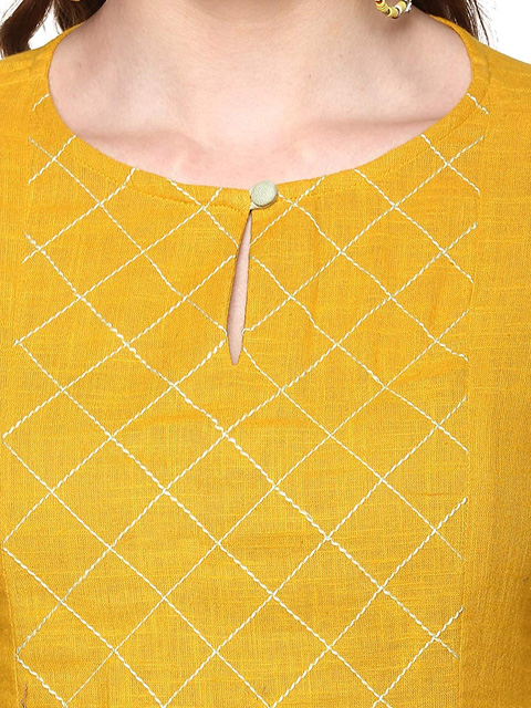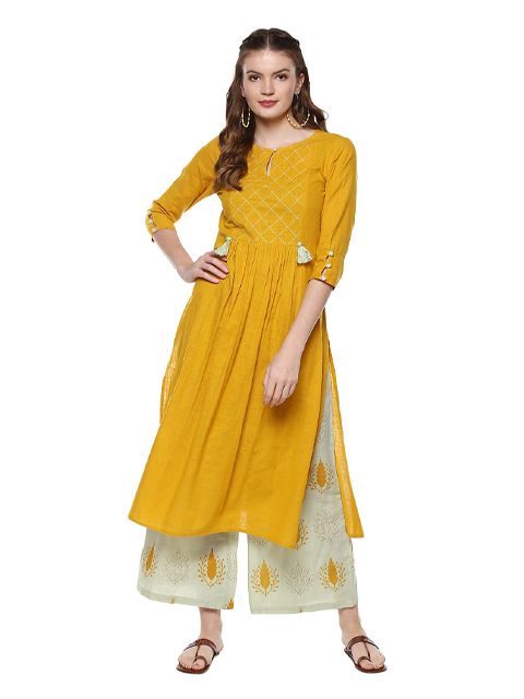 This mustard kurta set is crafted in cotton and has a regular fit. The kurta features a keyhole neck, 3/4th sleeves, and tassel detailing on the front, and side slits. This set also comes with palazzo pants featuring printed detailing.