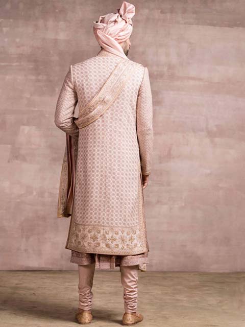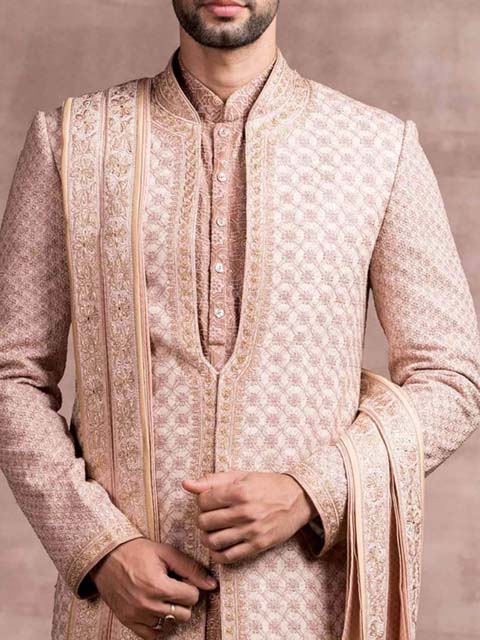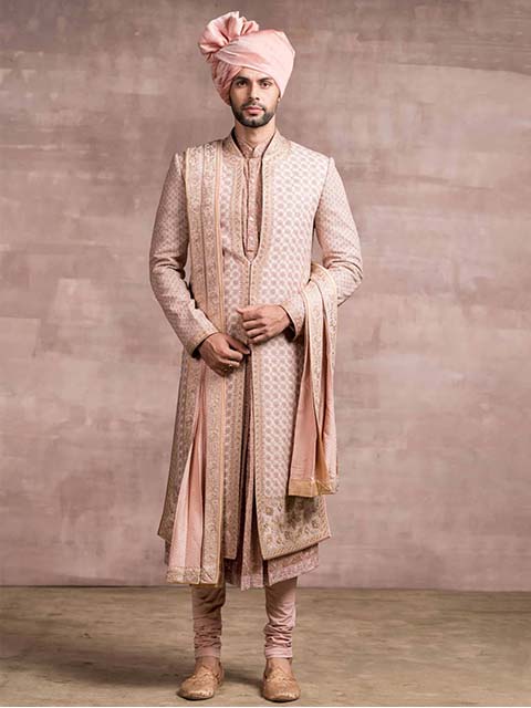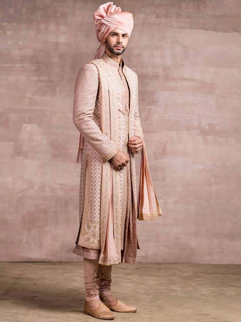 Peach sherwani with all-over aari, zardozi work paired with kurta & churidar. Comes with safa, stole, kamarbandh & jutti fabric.