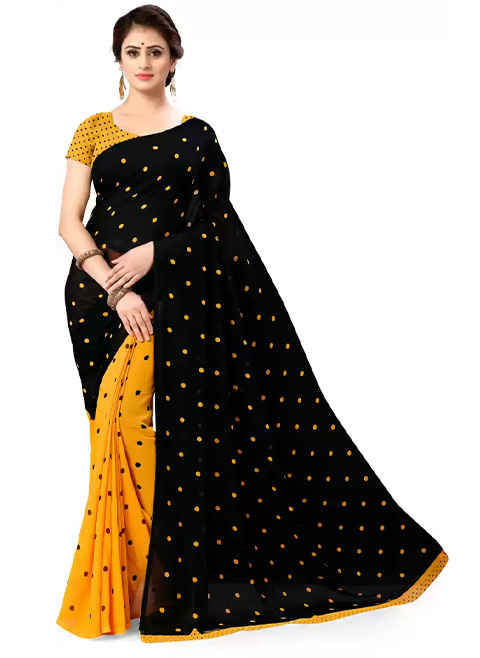 Half-and-half saree with black and yellow pola dots