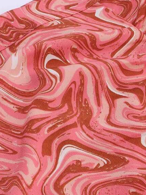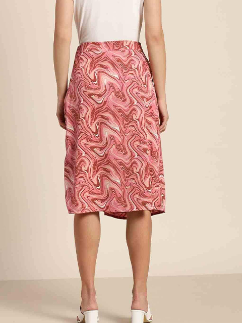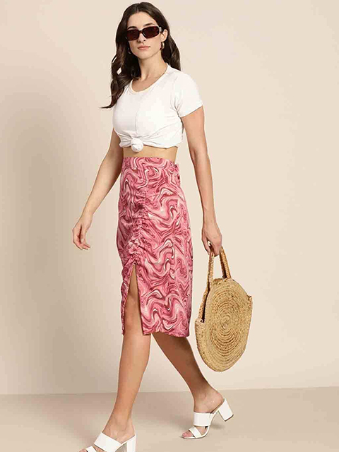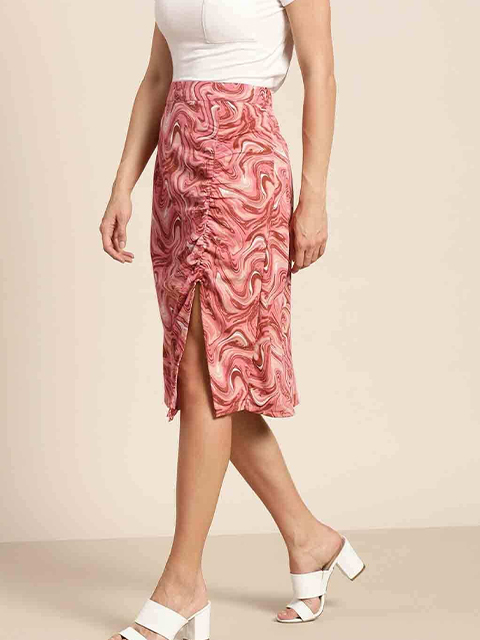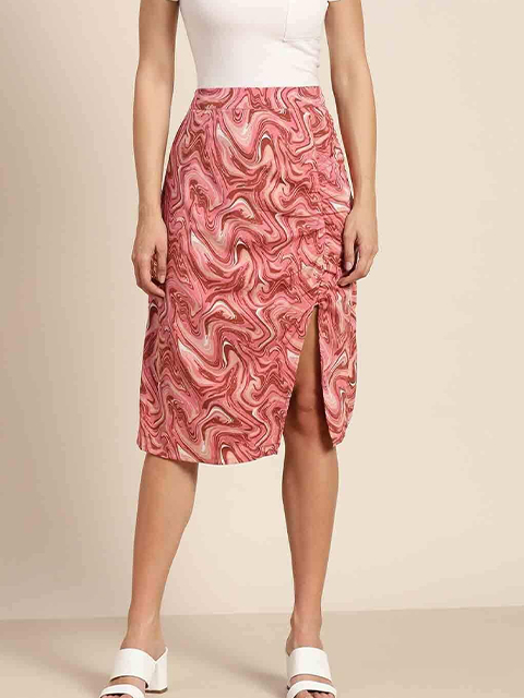 Peach-coloured abstract print a-line skirt, has ruched detail, high-slit, concealed zip closure