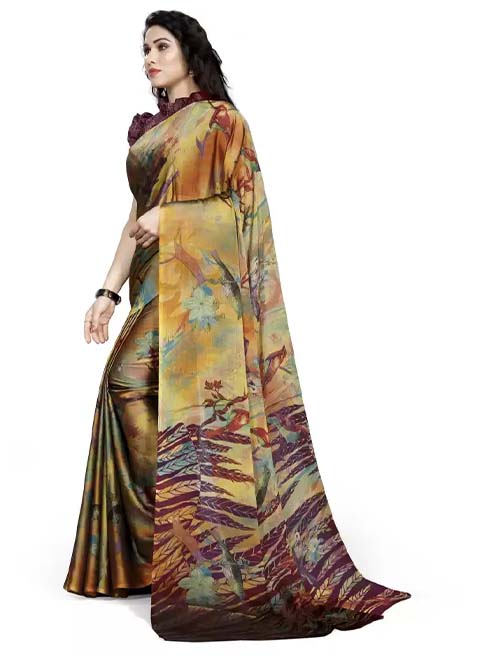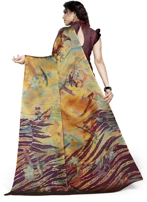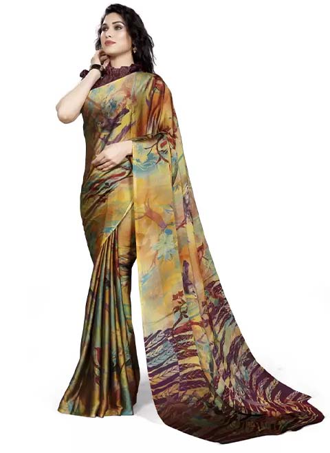 Here's the fancy multicolor forest style floral and bird prints that's perfect for parties, festivals and casual wearing. Our sarees are made and stitched with high quality poly chiffon fabrics and yarns under strict supervision. We're offering our products at reasonable prices.