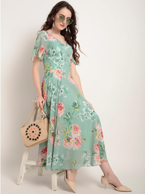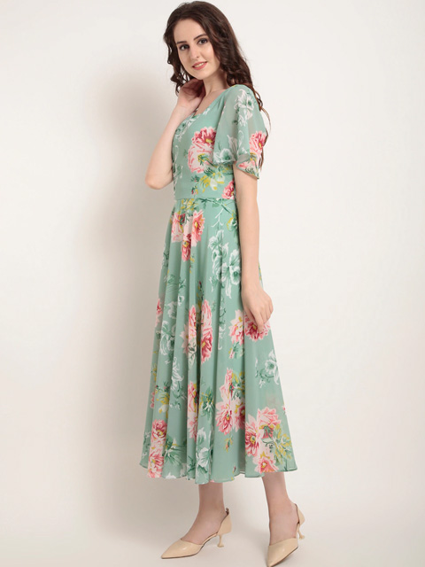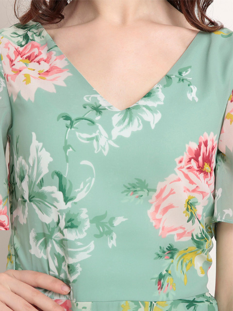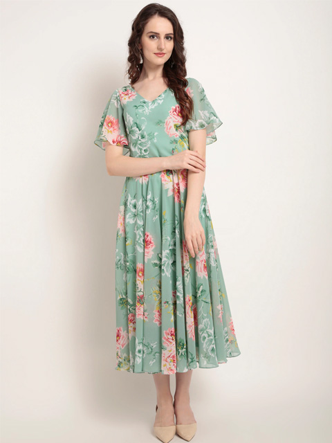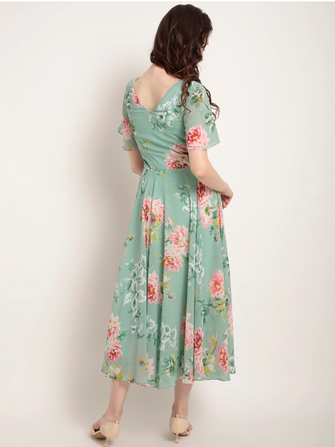 A trendy addition to your wardrobe this season comes in the form of this outfit. Maintain a chic appearance all year long with this trendy dress. Create an absolute style high by going with this printed green piece in combination with a killer shoe and trendy bangles for a perfect brunch look.