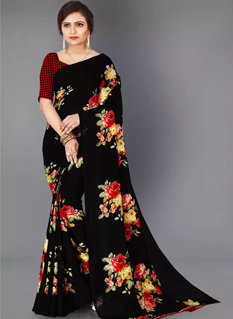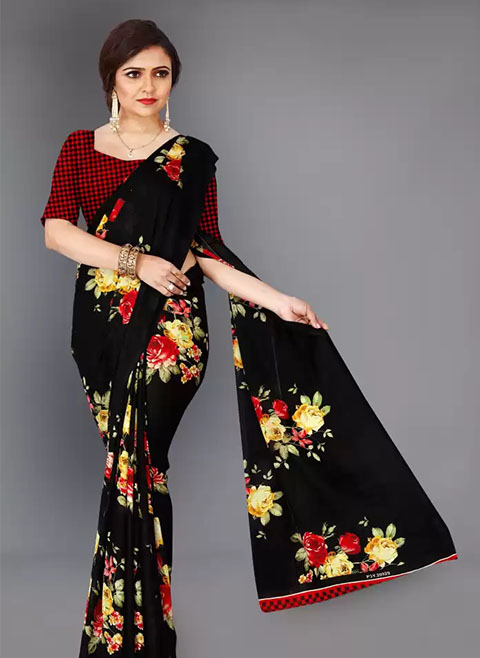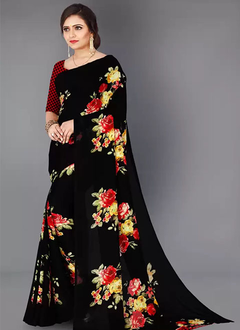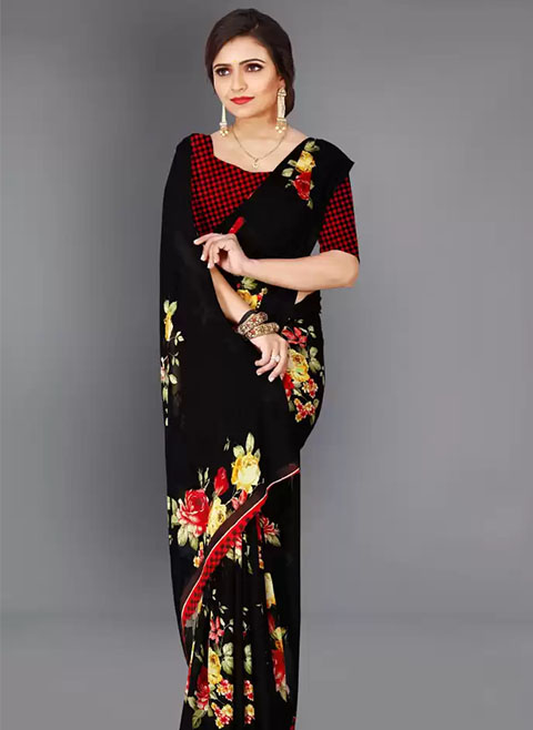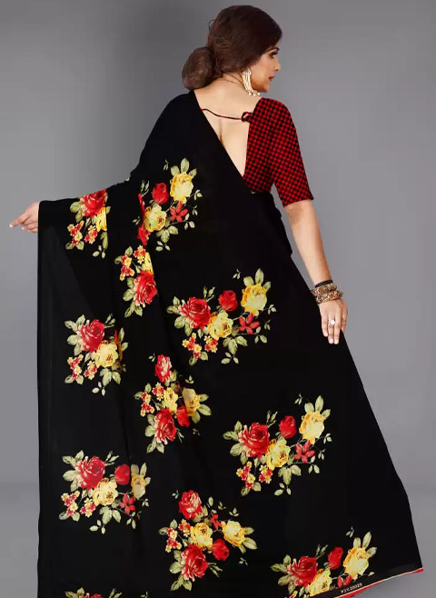 A black floral saree with an embellished border. Here's a mock-up of what the actual blouse would look like on the model
