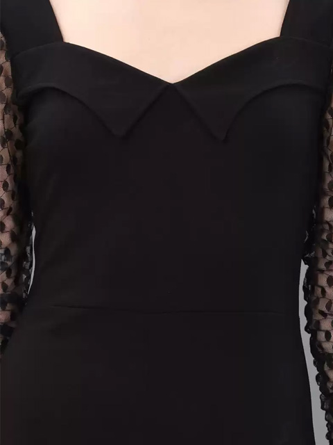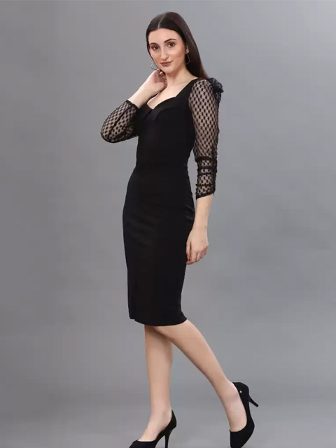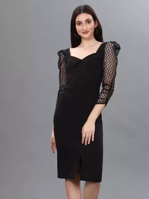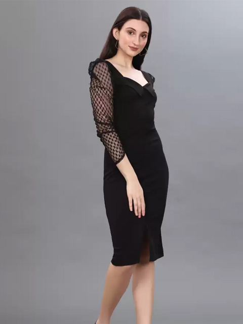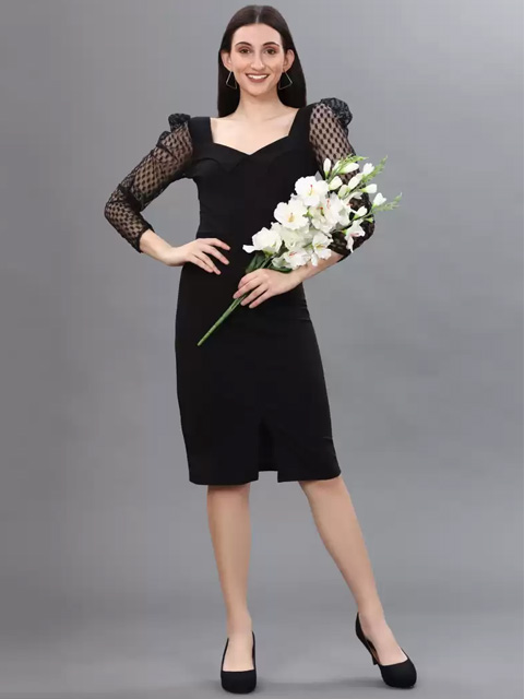 Black solid sheath dress with a sweetheart neck to look extra pretty.