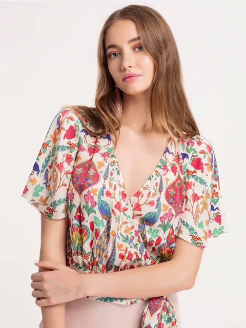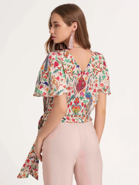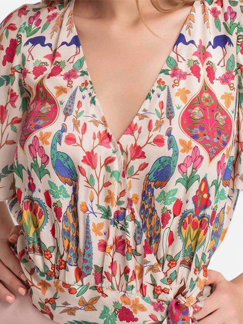 You'll love this printed peacock top with suited bottom wear.
