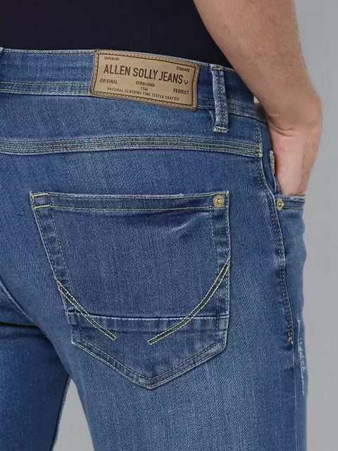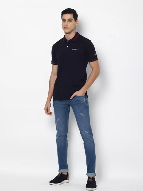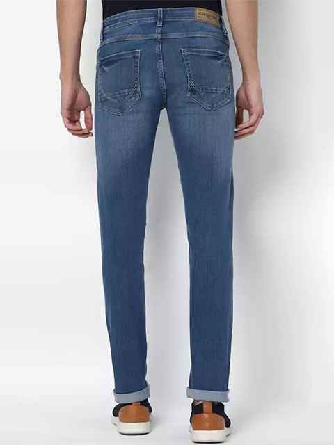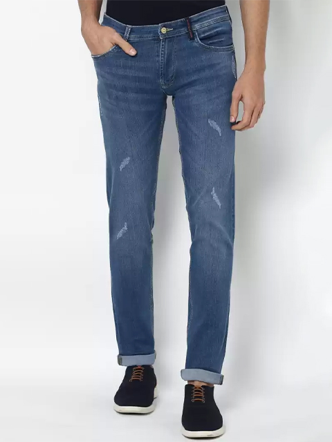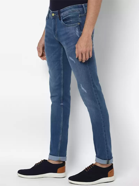 Wear these classy mid blue jeans for an affable look. The skinny-fit pants feature a mid-waist rise and are made from a cotton-spandex blend. Wear it with a casual graphic tee and derby shoes for a suave look.