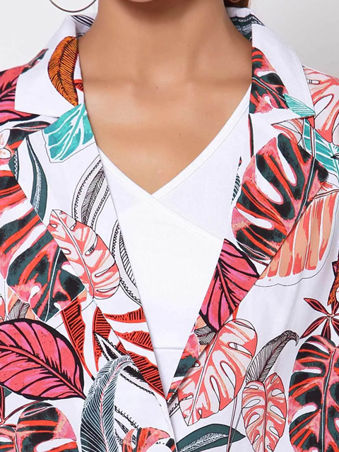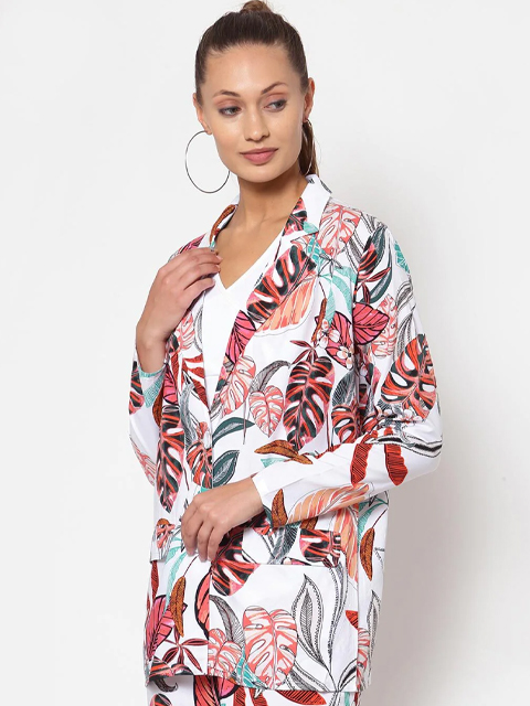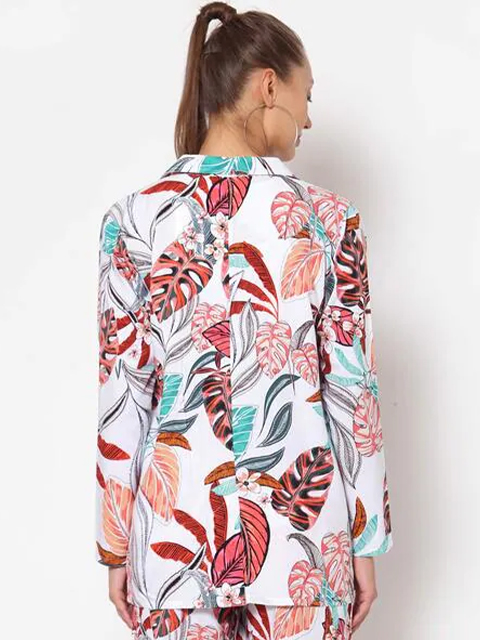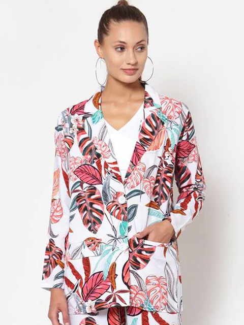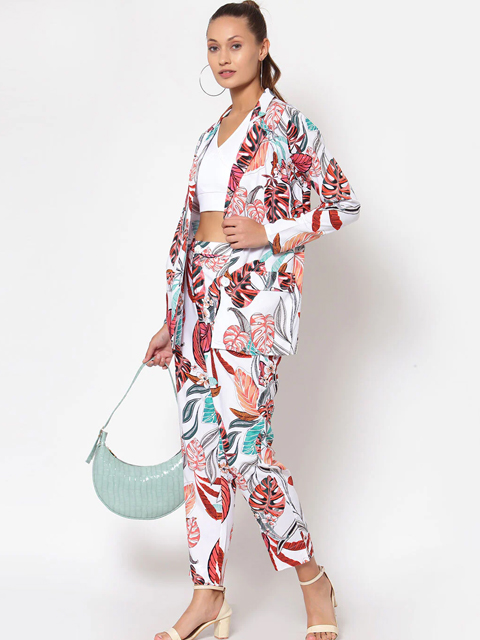 The woven blazer features a front pocket, notch collar, and slit at the back, while the printed pants feature side slits, an elasticated waistband, and button openings.