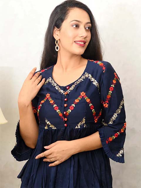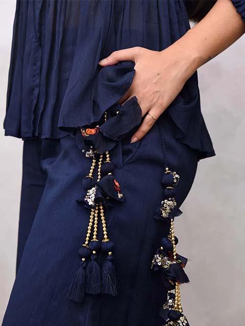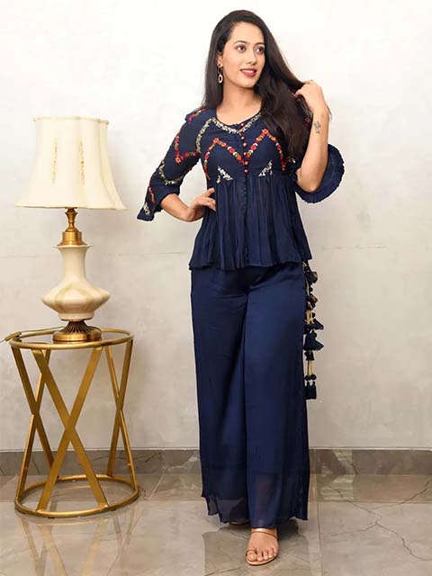 The navy blue top and palazzo set is a chic and classy way to impress everyone. There is nothing better than a chiffon dress for festive occasions than this one. You can wear it with heels for a pretty look if you wear it with heels.