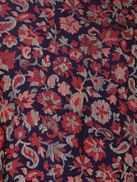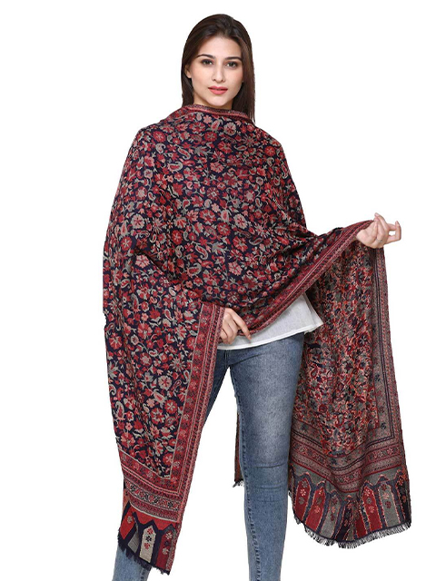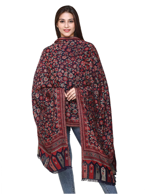 Navy blue, maroon and orange woven design shawl, has tasseled boarder