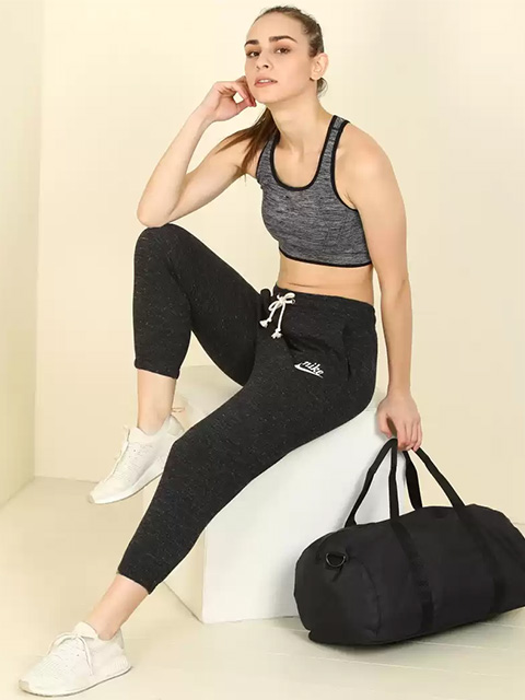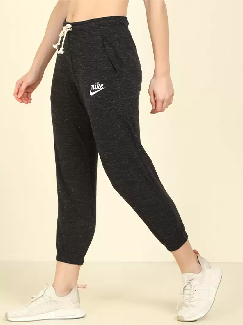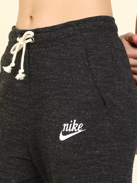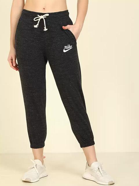 An elasticated cuff and a melange effect on the hem make up a black sports capri. A drawstring closes the elastic waistband.