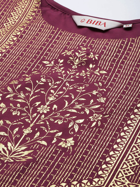 Kurta with trousers and dupatta in Maroon. This is a floral print with an A-line shape. An above knee length jacket with a Round neck, three-quarter regular sleeves, and a straight hem made of poly silk machine weave fabric.