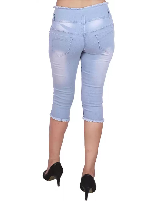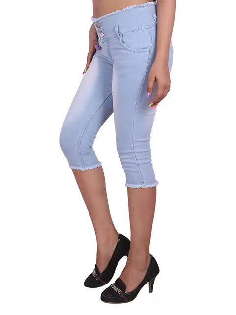 Solid blue capris with a buttoned waistband and five pockets