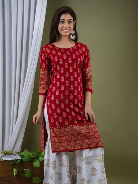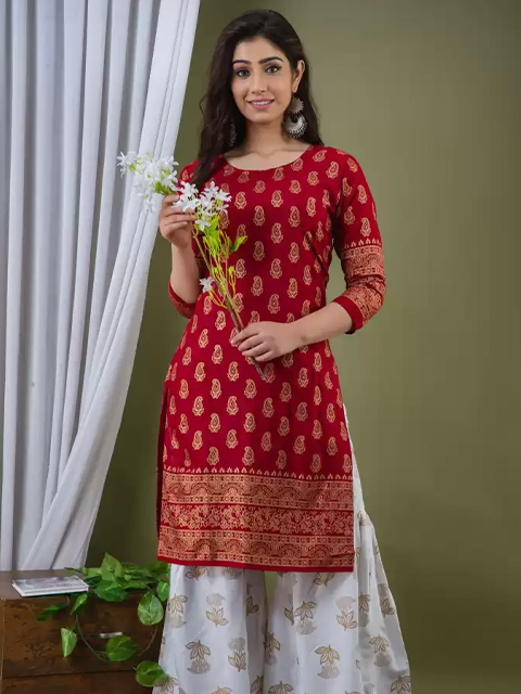 Make a lasting impression with this kurta set. Crafted in a breathable fabric, this stunning kurta and sharara set with dupatta is perfect for festive occasions. Style it with juttis and traditional jewelry to complete the look.