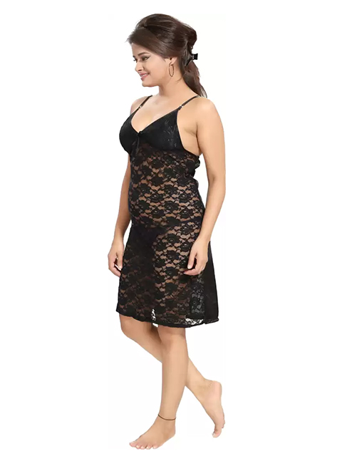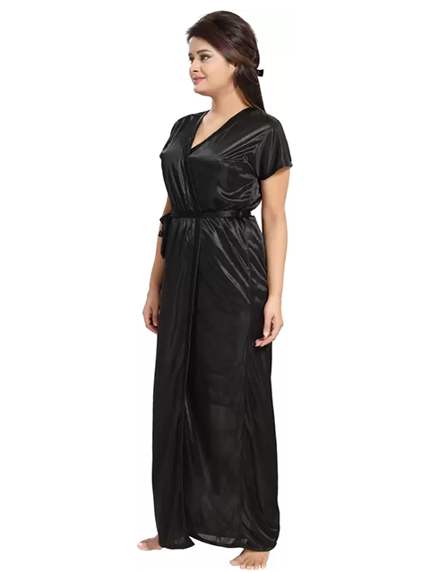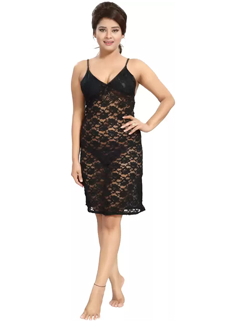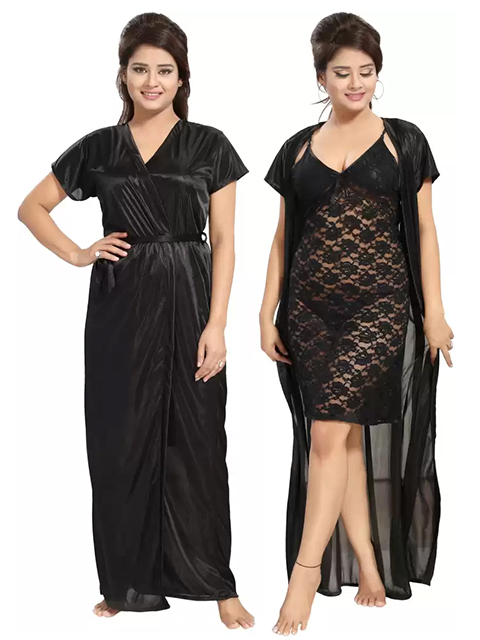 Introduce a breath of fresh air to your sleep routine with Nighty. Designed exclusively for contemporary women, we offers range of nightwear that will perfectly complement your sense of style. You can make your sleeping hours more comfortable and your intimate moments more enjoyable when you opt for this night robe & night slip set. The night slip is adorned with beautiful net and lace work that makes it pleasing to the eyes. Made of soft and fine satin, the set is comfortable to wear and comes with a silky finish. The night robe features a tie-up fastening that makes it convenient to wear.