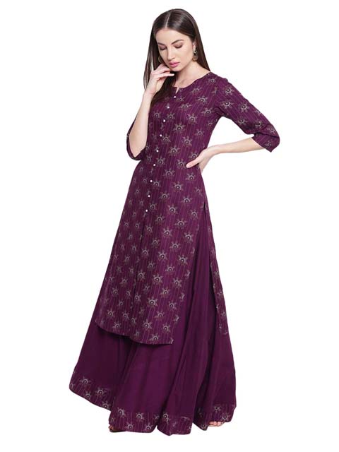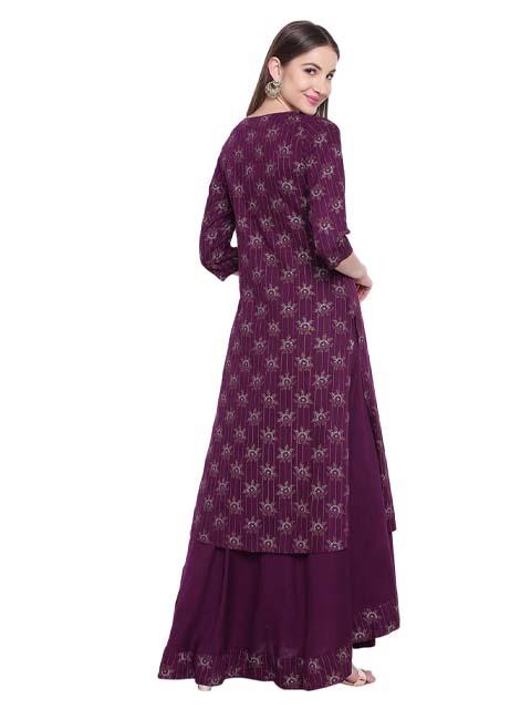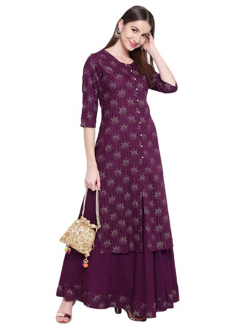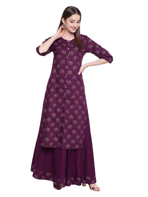 A Royal Purple Printed Suit Set From latest collection. This Floral Printed Suit Set is Crafted In Pure Cotton Fabric, Kurta Has Mirror Work On York And Solid Pant Set Will Give You A Perfect Look For Your Casual Outings.