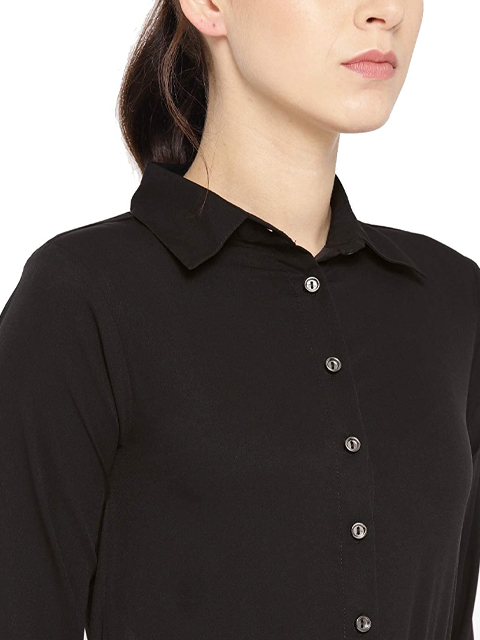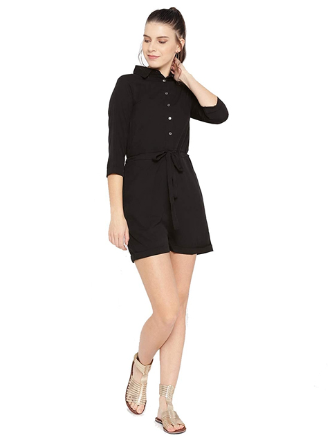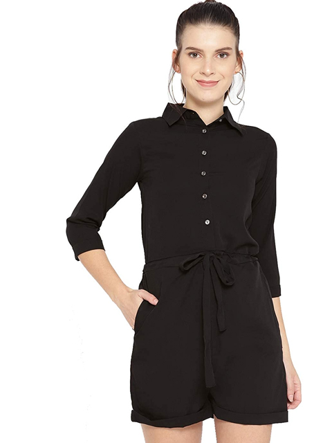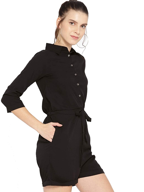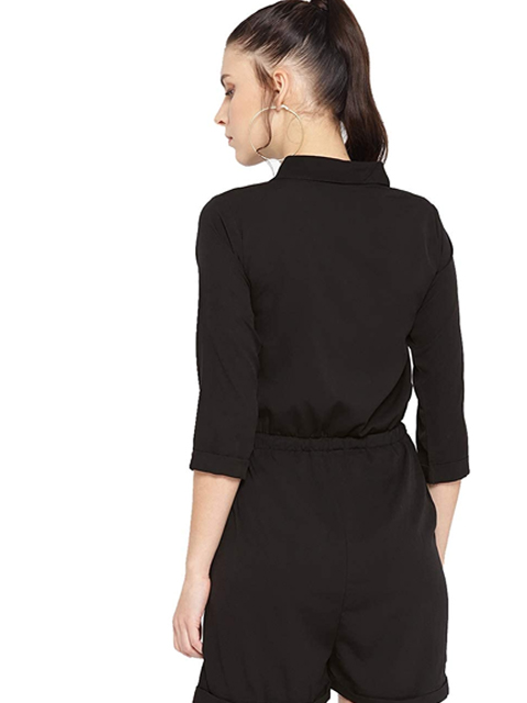 This black solid playsuit has a shirt collar, long sleeves, and 2 pockets