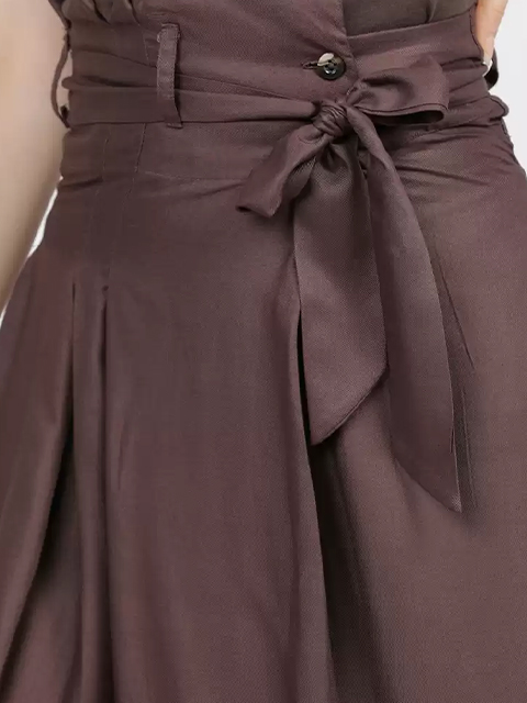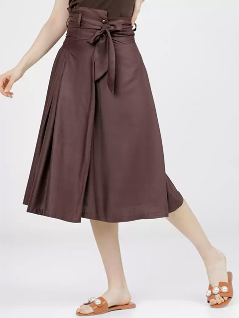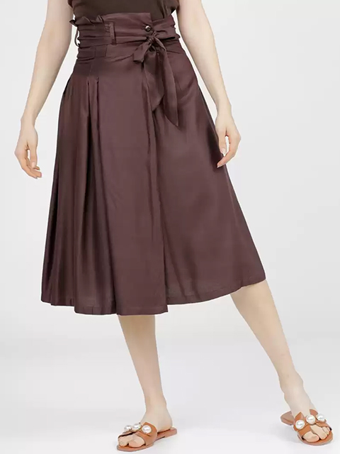 Brown solid regular-fit A-line midi skirt with tie-up detail, has a waistband with button closure and a flared hem