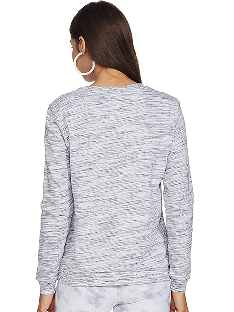 It features a round neck, long sleeves, a back closure, and a ribbed hem.