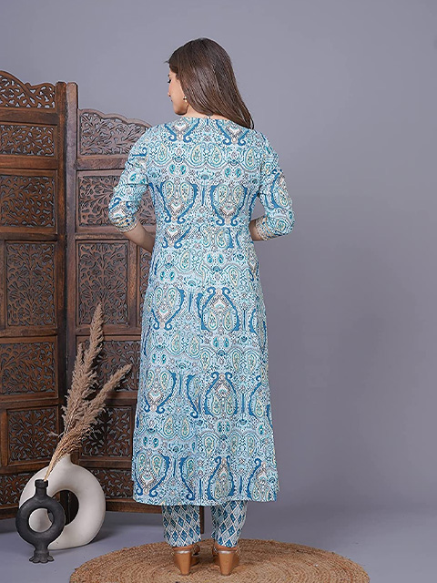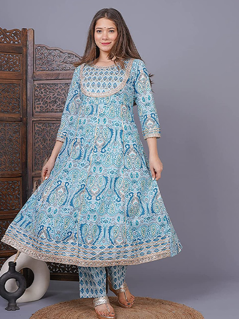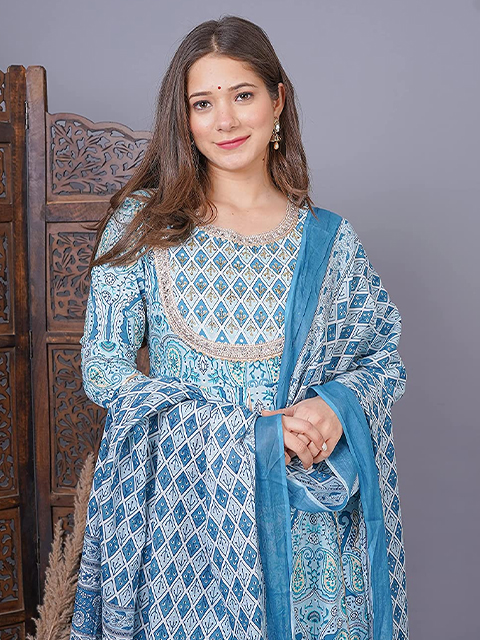 Add to your wardrobe this distinctive blue color Anarkali set with printed florals and complementing dupatta paired with calming white palazzo.