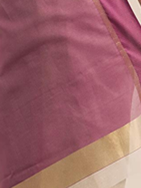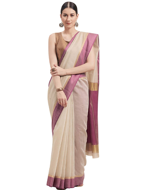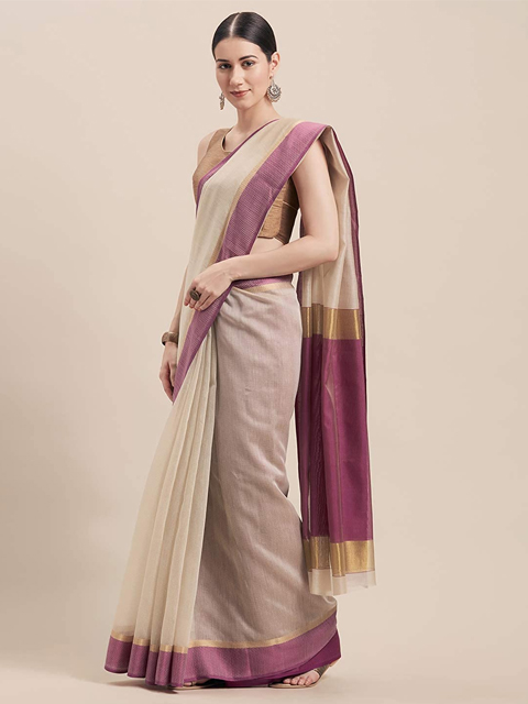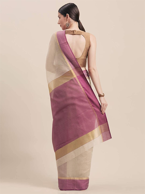 Beige & Purple Cotton Blend Woven Design Saree