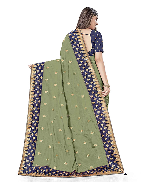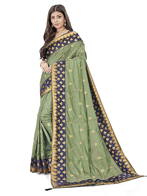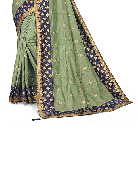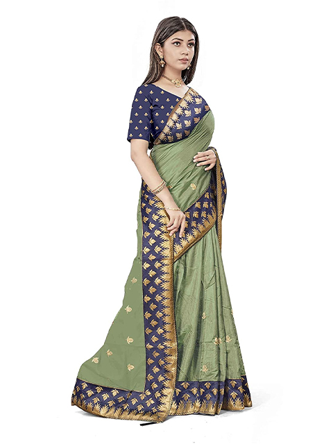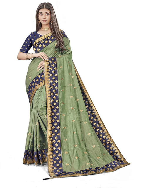Half and half saree with green & blue Sana silk zari embroidery. The saree comes with an unstitched blouse. Model's blouse might just be for modeling purposes. You can see how the blouse piece looks in the image.