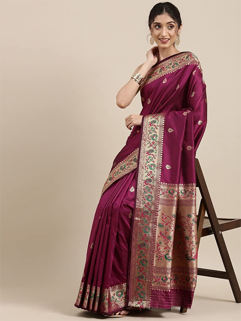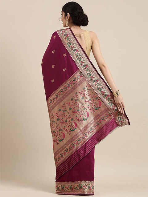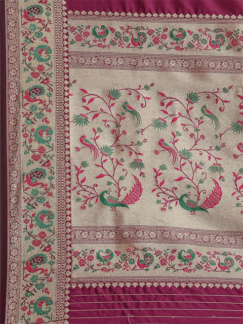 Design Details: Red and Golden paithani woven design saree and has a zari border