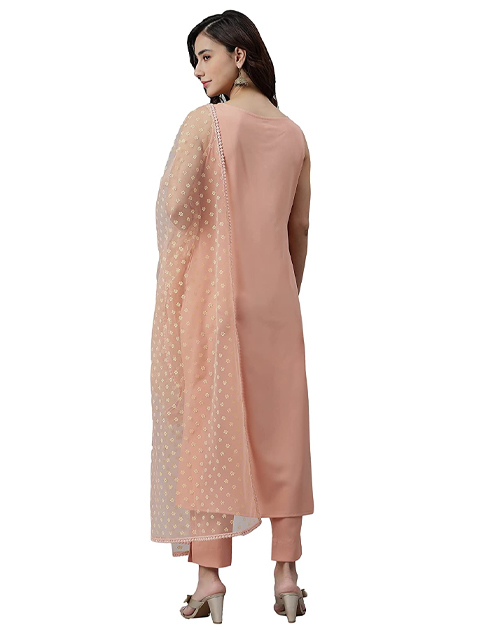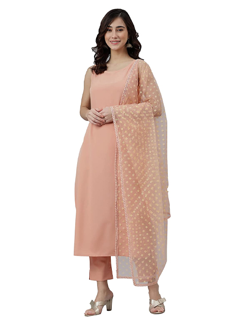 Womens Peach Poly Crepe Kurta with Pant and Dupatta (Set of 2)