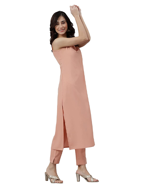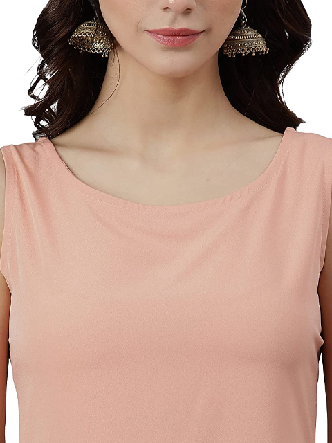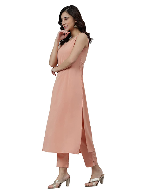 Solid sleeveless peach poly crepe straight kurta with peach partially elasticated poly crepe pant