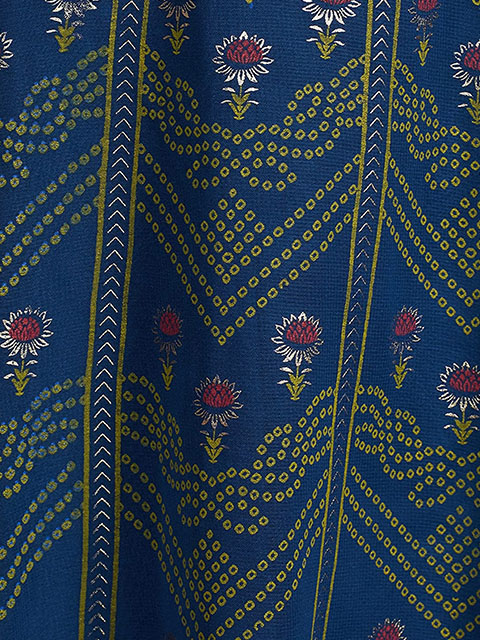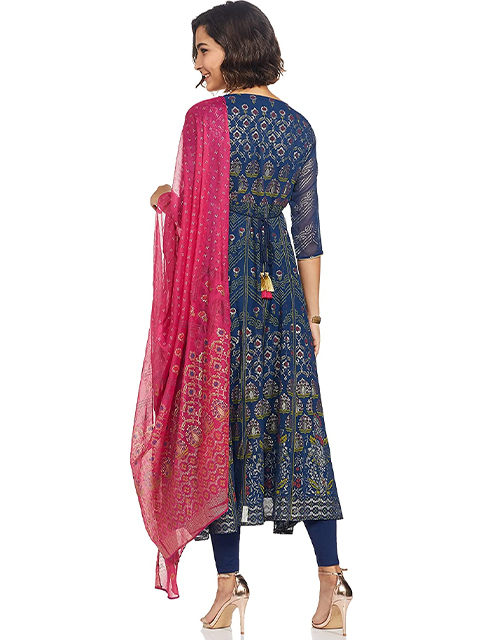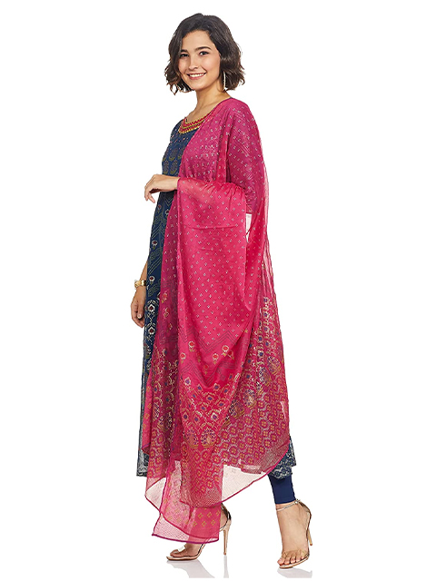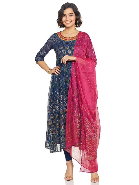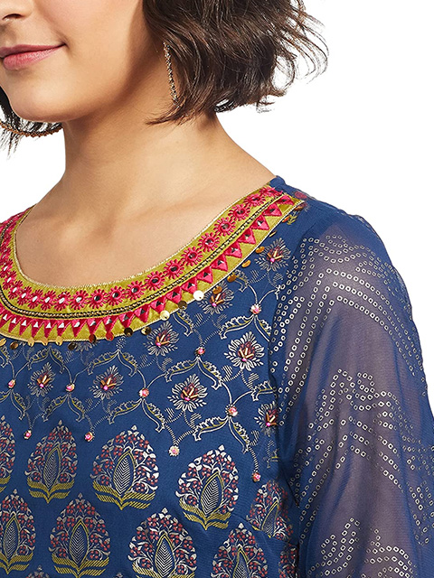 Embrace the femininity in you and style in this chic ethnic set. The set includes smoke blue straight silhouette kurta in floral print and sequin detailing. It is coordinated with red straight palazzo in mid-rise and printed dupatta.